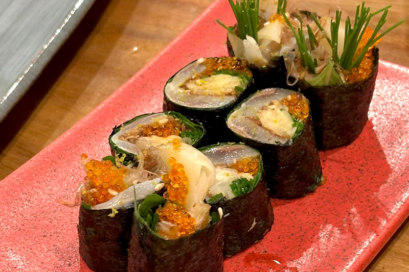 自家〆の小肌にガリ、大葉、芽ネギ、ゴマ、トビコを海苔で巻いたアテ巻き